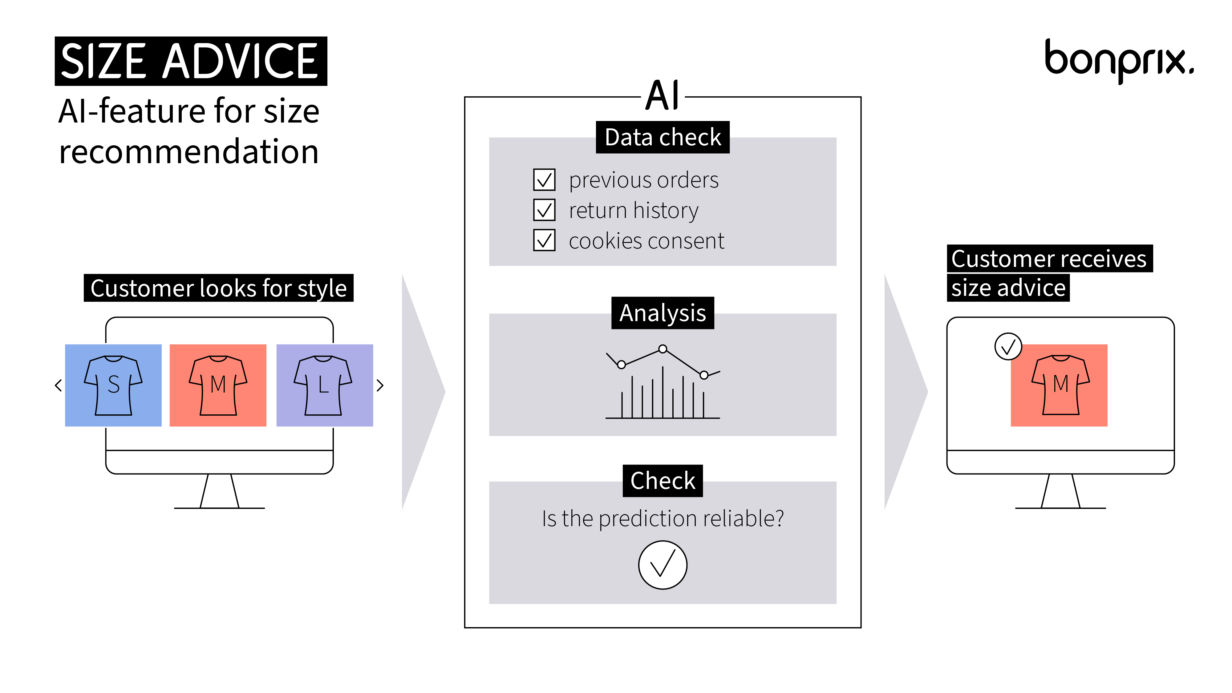 Finding the right clothing size is one of the biggest challenges when shopping online. Many solutions require customers to actively provide data such as their height and weight. bonprix has deliberately chosen a different approach: existing bonprix customers do not have to do anything. Size Advice combines individual purchase and return history with detailed item data, such as material specifications and product measurements, and uses this to calculate a reliable size recommendation in real time. The underlying AI model only makes a recommendation if the forecast accuracy is sufficiently high. The recommended size then appears automatically on the product page. The feature was developed in-house by a team of AI experts and programmers at bonprix.